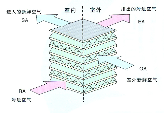 当室内空调回风和新风分别呈正交叉方式流经热交换器时,由于平隔板两侧气流存在着温度差和水蒸汽分压力差,两股气流间同时产生传热传质,引起全热交换过程。这种过程是经过平隔板完成的,所以,属透过型全热交换。当安装在系统上的全热交换器在夏季运行时,新风从空调回风中获得冷量,使温度降低,同时被回风干燥,使新风湿度降低;在冬季运行时,新风从空调回风中获得热能,使温度升高,同时被回风加湿。就是通过这样的全热交换过程,让新风从空调回风中回收了能量。