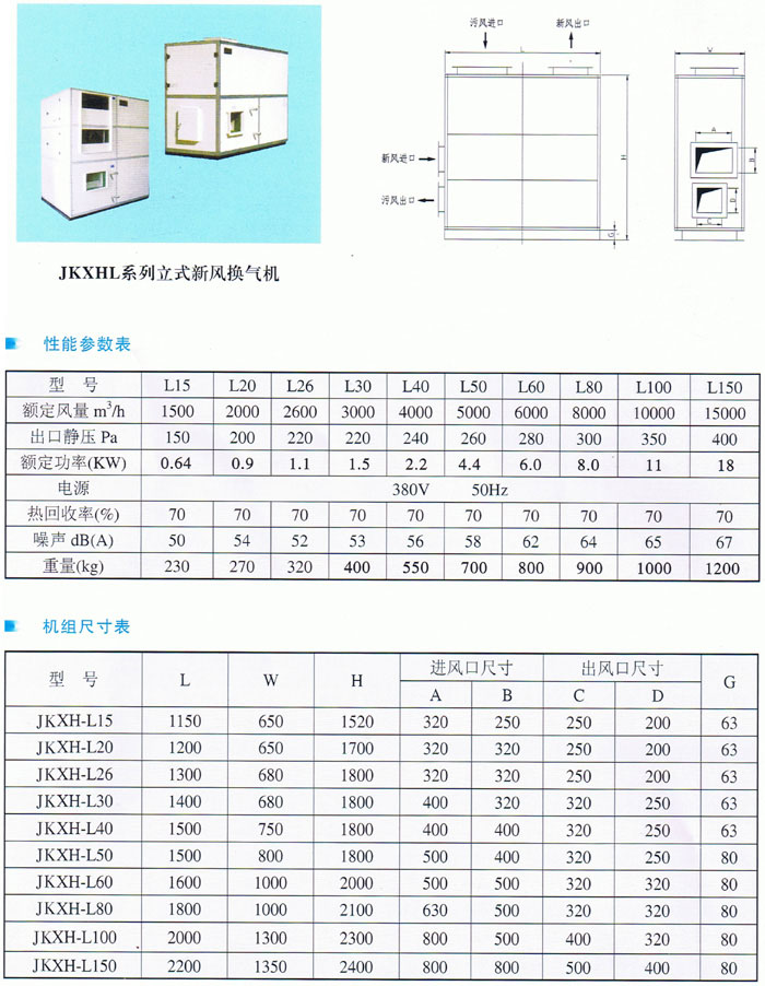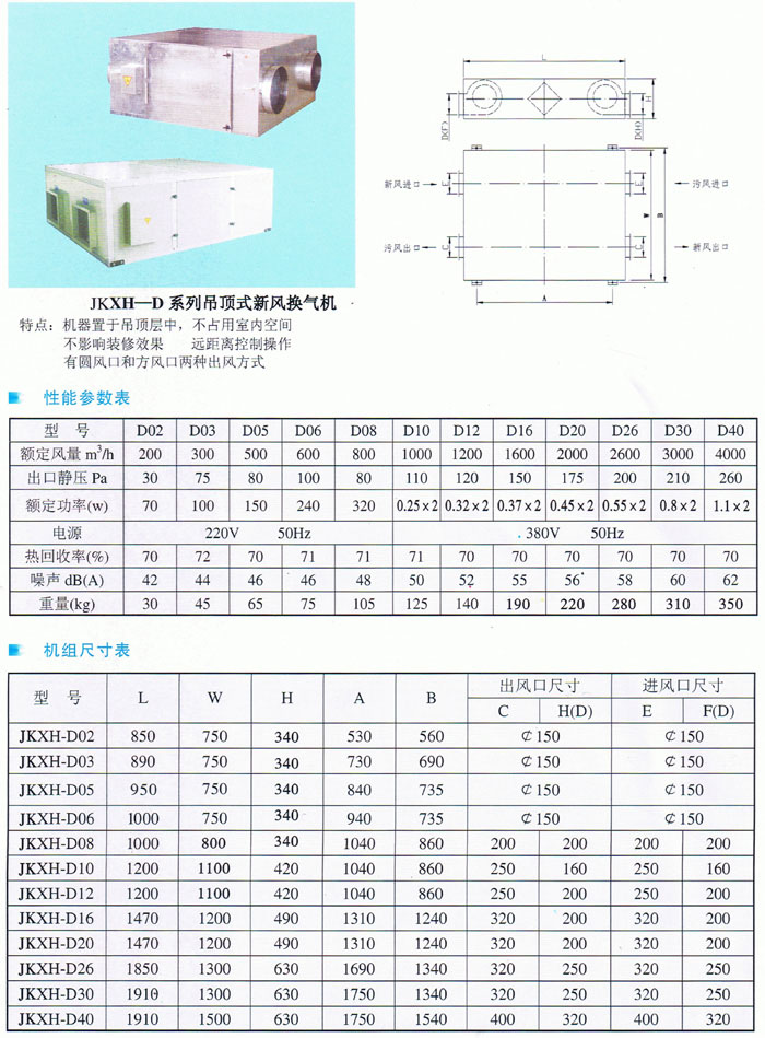 由于气流通道的改进,运行时噪音水平只有 38-64dB(A)JKXH-D 系列产品结构设计紧凑合理,适宜走道吊顶或天花板内安装,也可装置安装。热回收器采用先进科技,用特殊材质化学处理加工而成,具有阻燃性,对温度、湿度、冷热能量回收起到 佳效果,使用效果超过同类进口产品。 |